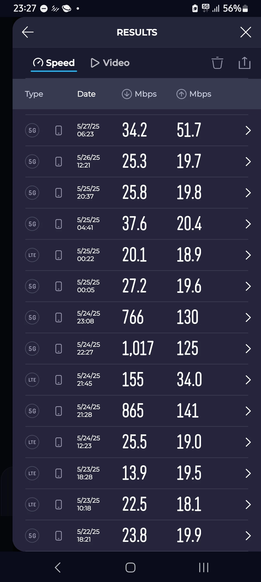 - tot 19 mei tikte Unlimited50 speedtest 5g heel even de 100Mbps aan waarna het meteen zakte tot rond de 50 Mbps.