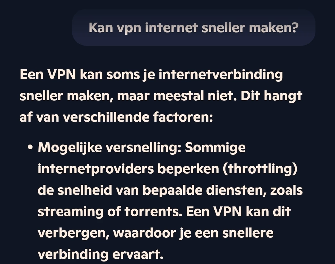 Screenshot is van Microsoft Copilot. Met gratis Proton VPN is bij mij 5g én 4g weer standaard op de gewenste snelheid. Er is dus in principe niks mis met mijn toestel of met de verbinding, het lijkt een extra afknijping door KPN die mijn VPN voorkomt . Het verschil is wél merkbaar, een internetsite komt in 2 seconden binnen in plaats van in meer dan 3 seconden. Alle apps met data transfer draaien soepeler.