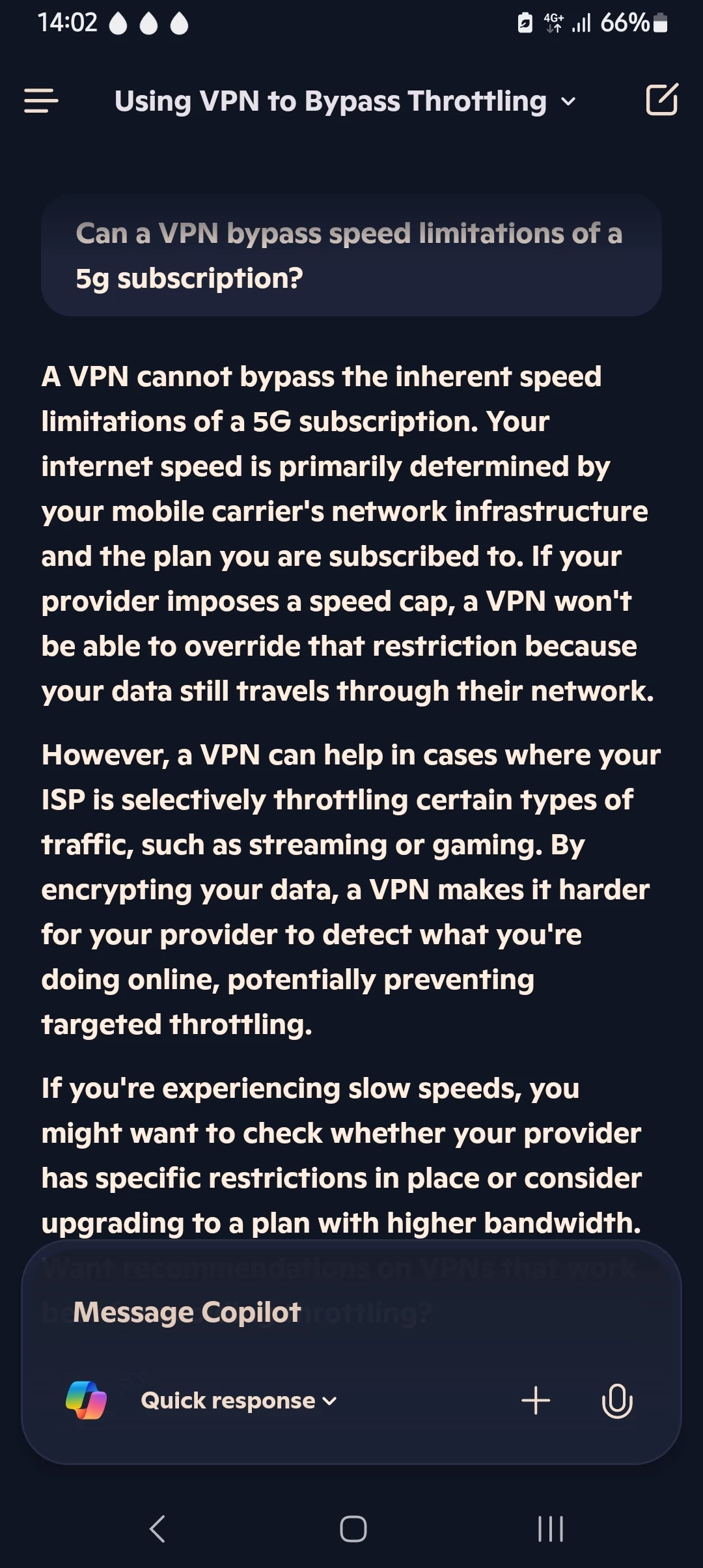 Het gratis Proton VPN werkt uitstekend en heeft geen datalimiet. Snelheid 4g en 5g blijft met die VPN ± 50 Mbps. Ik blijf dat maar gebruiken. Het zorgt ook voor iets stabieler online schaken op Lichess.