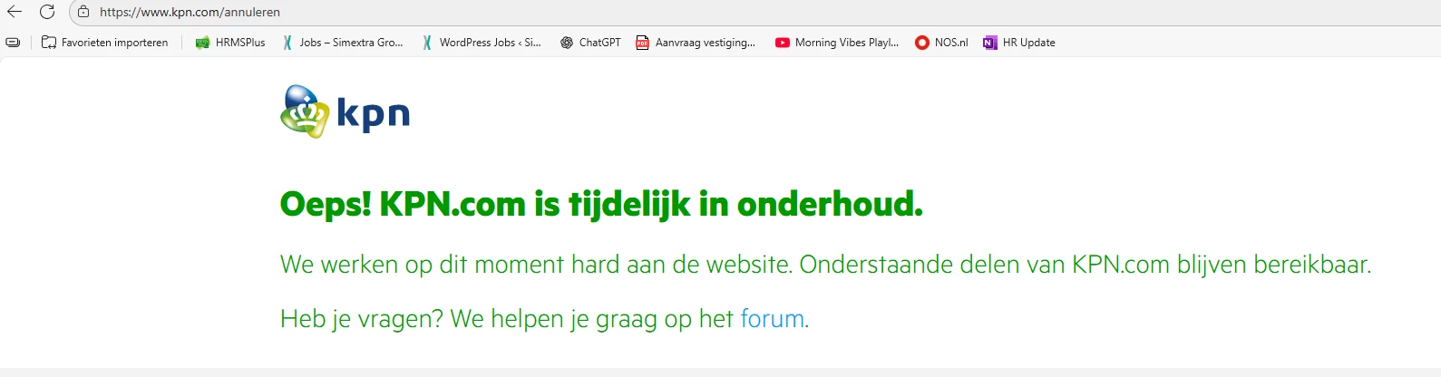 Ik heb onlangs mijn  abonnement verlengd. Het nieuwe abonnement gaat pas 13 oktober in. Nu wil ik mijn verlenging toch aanpassen van sim only naar abonnement met toestel. Echter, ik kan op geen enkele manier een afspraak maken met KPN (er is een storing als ik een belafspraak wil maken). Ik zit in het buitenland dus een 0800 nummer bellen lukt ook niet.