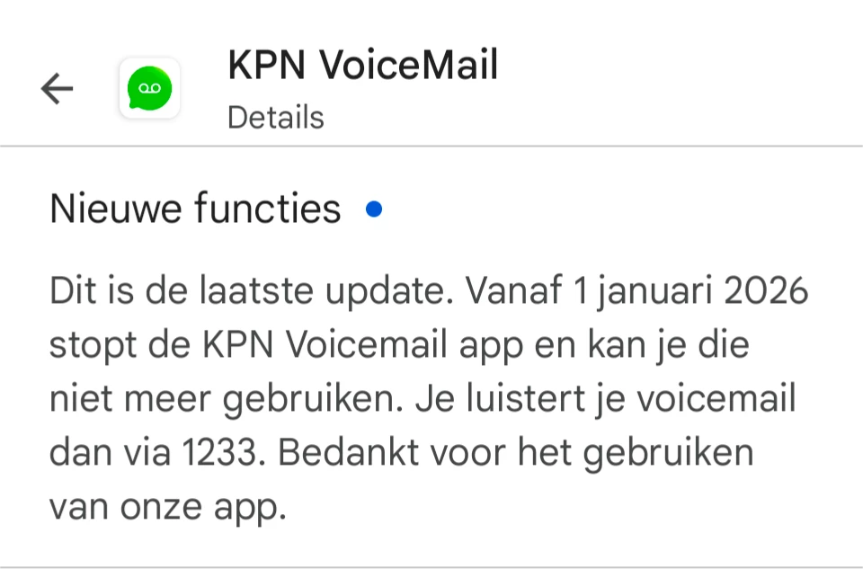 Hoi ​@RonaldM01, de VoiceMail app voor Android stopt inderdaad per 1 januari 2026. Dit geldt alleen voor Android, iOS heeft Visual VoiceMail ingebouwd in hun eigen Telefoon app. Daar verandert niets aan.