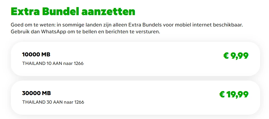 Dit zijn de bundels die momenteel beschikbaar zijn in Thailand. Alle bundels kan je (per land) bekijken op onze site. Is bellen via Whatsapp, dus via je mobiele internetverbinding, misschien een oplossing? Ik neem jouw signaal sowieso mee ter verbetering.