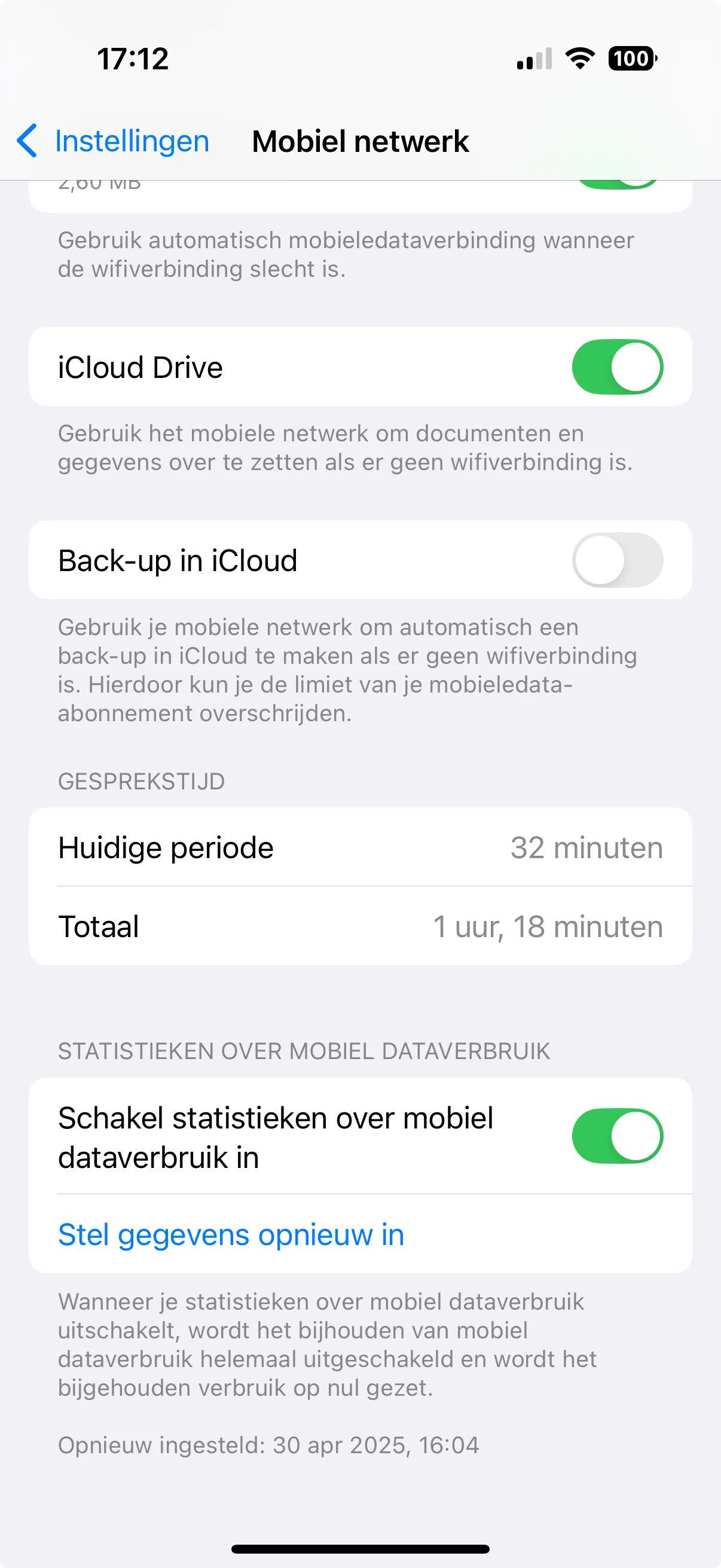 Ik heb zelf geen iPhone, maar ik begreep van een vriend dat iOS inderdaad vanaf het begin blijft doortellen totdat je het zelf reset. Op mijn Samsung (Android) kan ik een maandperiode instellen (gelijk aan mijn factuurperiode) waardoor ik precies weet wat ik per maand heb gebruikt.