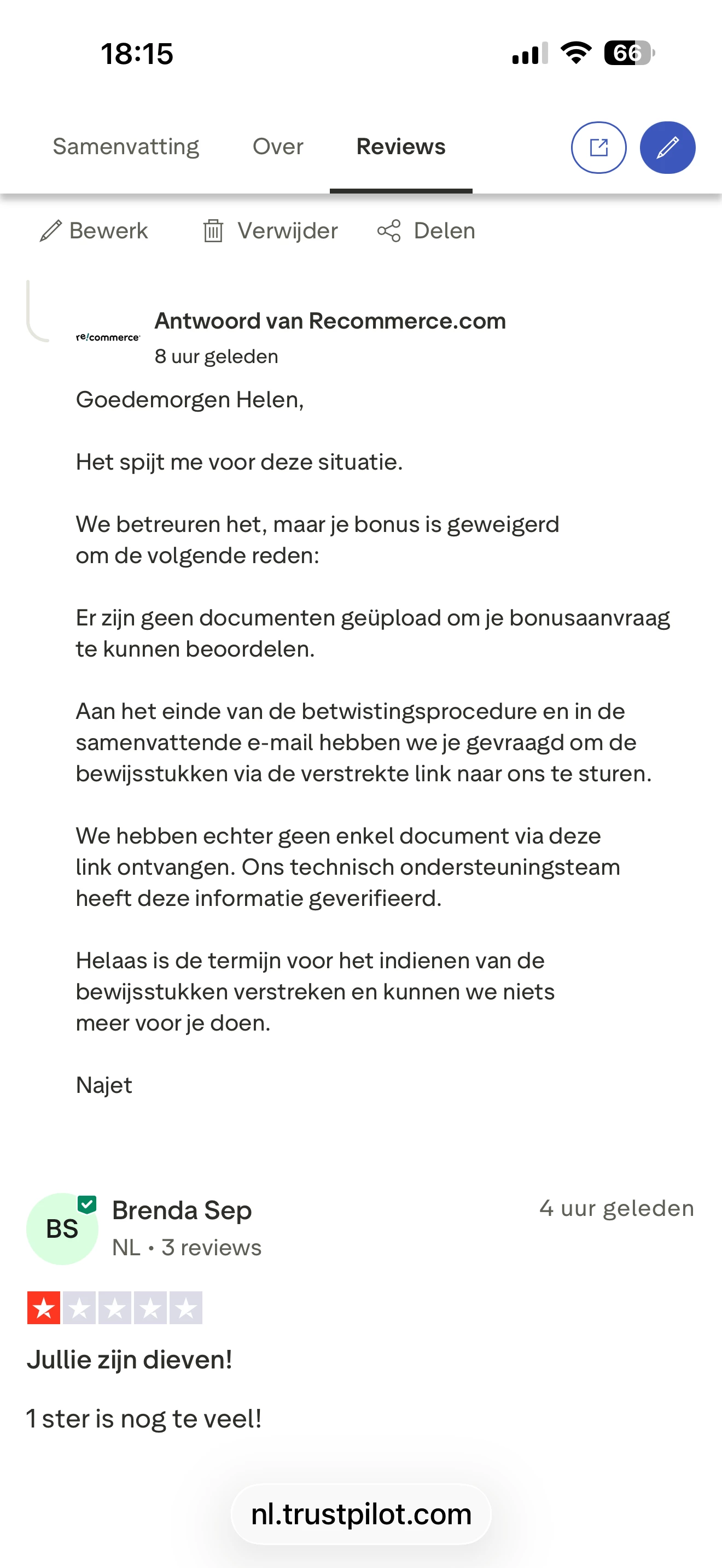 ik lees op het forum veel klachten over Recommerce en ik ben helaas ook al weken aan het wachten op de extra uitbetaling van € 150. Berichten sturen naar deze firma heeft totaal geen zin want je krijgt alleen maar vage antwoorden terug. Ik ben nu al zes weken aan het wachten op mijn geld. Aangezien de actie via jullie loopt zou ik het erg fijn vinden als jullie deze zaak voor mij gaan oplossen. Ik lees in de diverse antwoorden dat we toch echt bij Recommerce moeten zijn maar daar ben ik het niet mee eens aangezien deze hele actie door jullie is aangeboden. Ik hoop dat jullie dit snel voor mij kunnen oplossen
