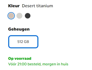 Maar, de 512GB Desert Titanium wel, en deze is op voorraad en direct leverbaar.