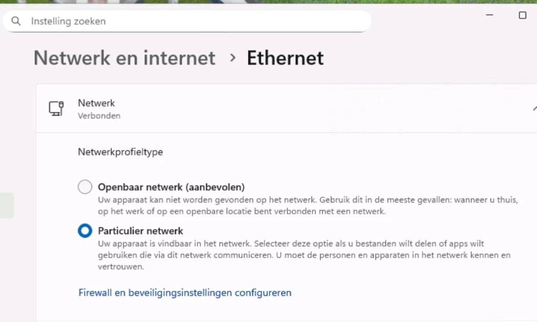 Het is per verbinding. Dus een pc die via WiFi verbonden is kan op Particulier netwerk staan. Als die pc later via kabel verbonden is, dan kan die op Openbaar netwerk staan. Dan moet je dat dus aanpassen naar Particulier.