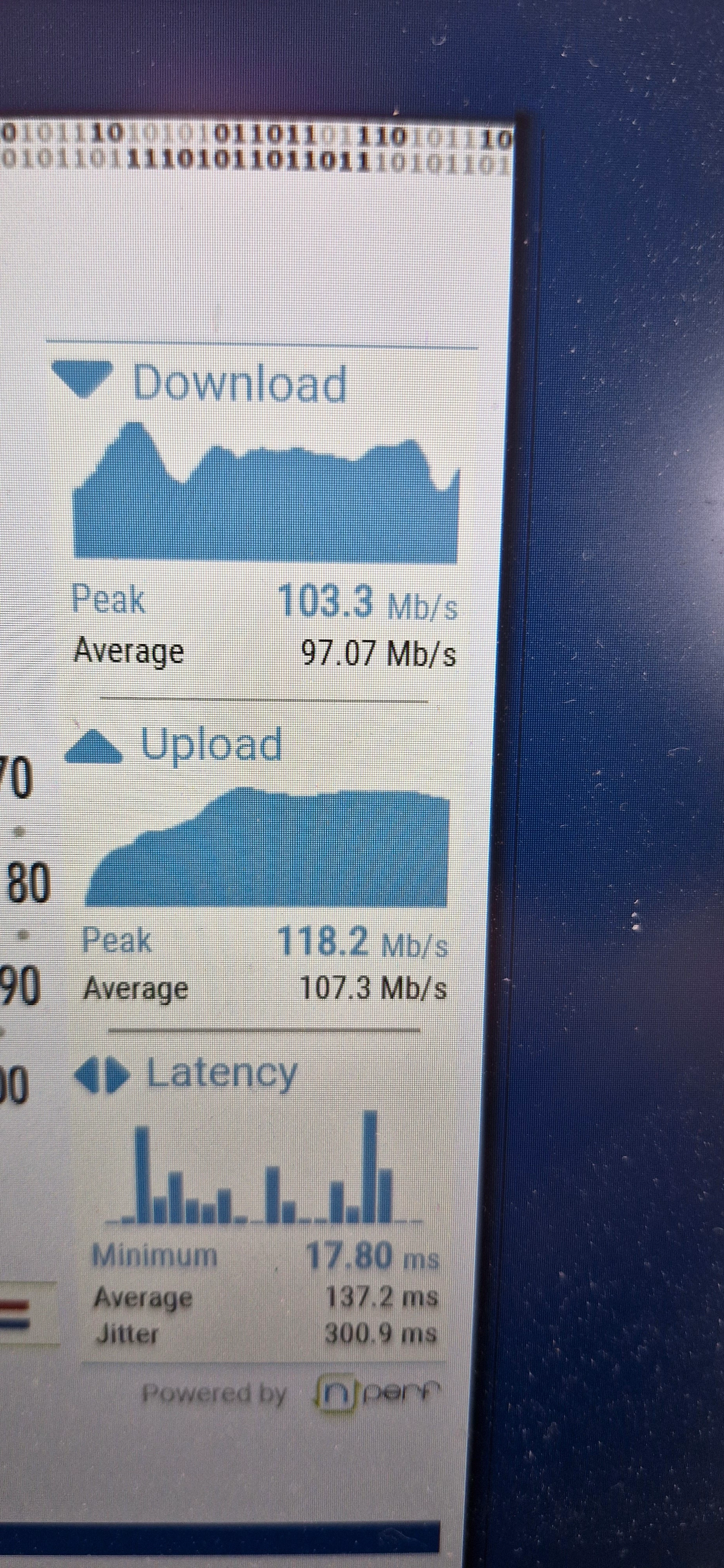 Via WIfi nu weer 97mb down, 107mb up. Gisteravond kwam ik niet boven de 38mb uit: