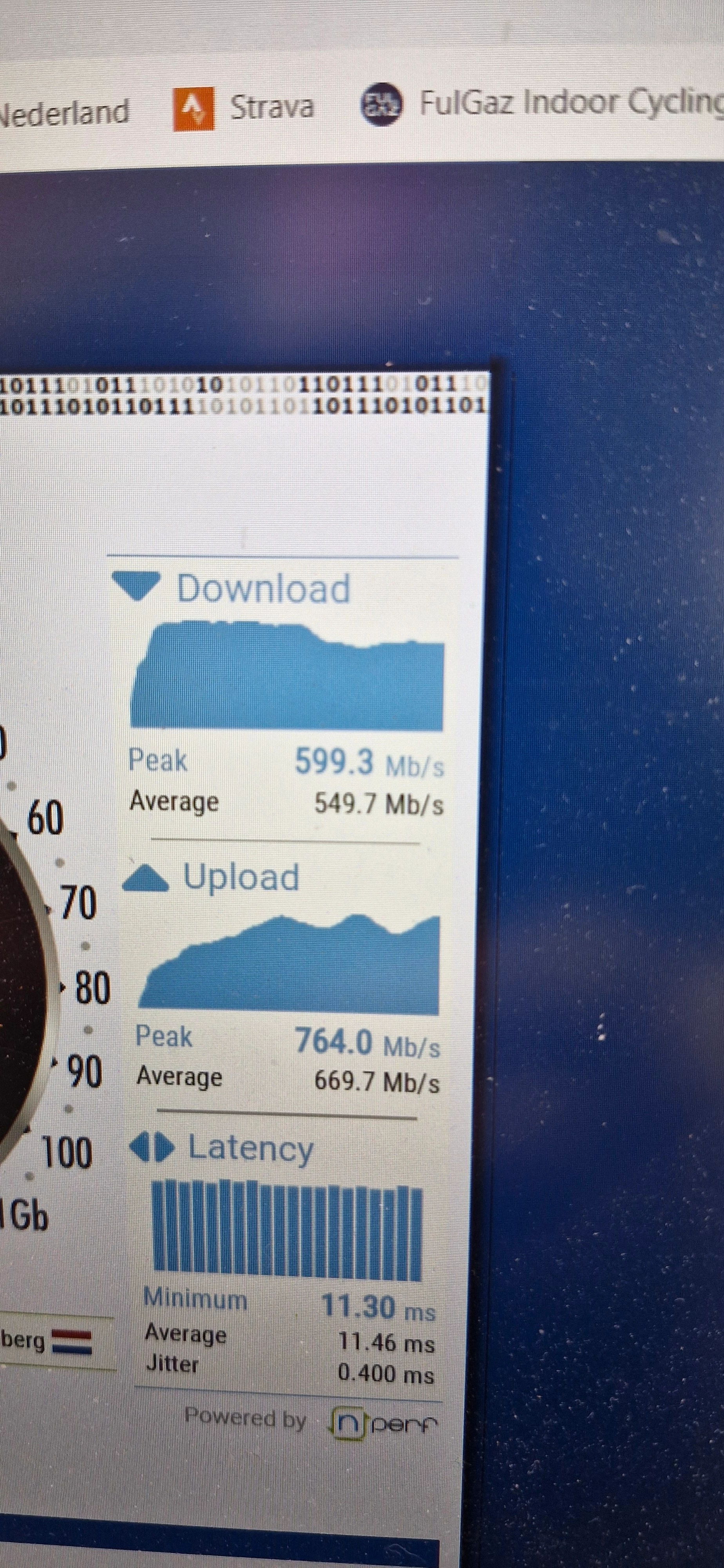 Nee bekabeld: 600mb down, 750mb up, ping 11ms, ping 17.8ms