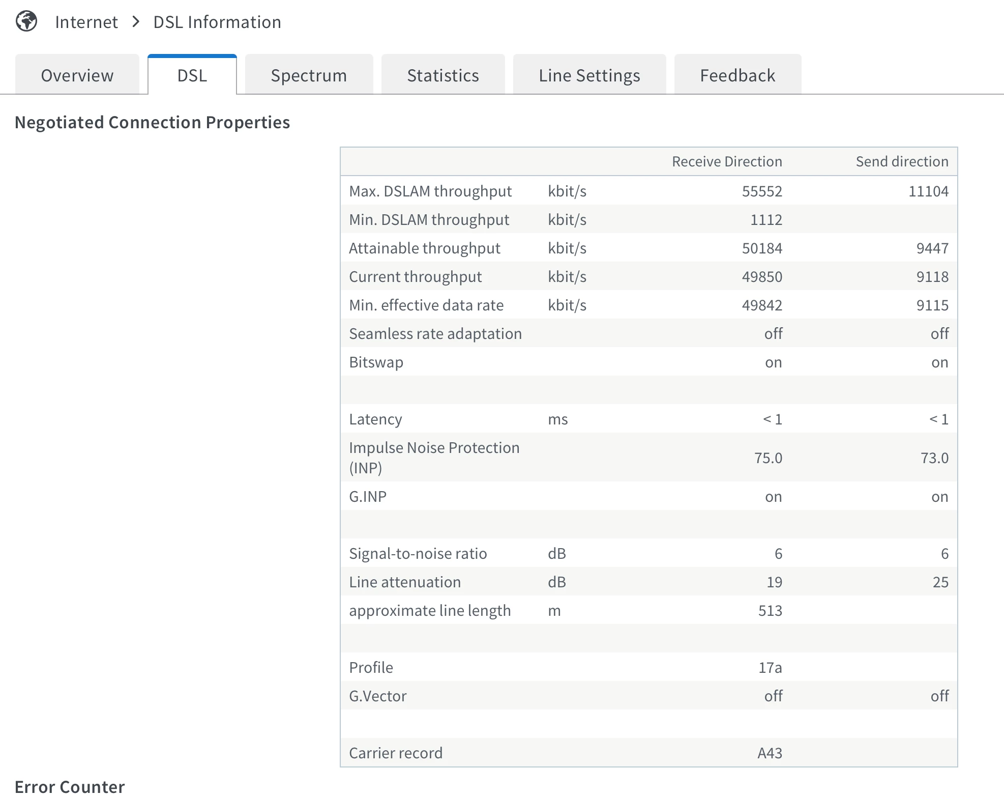 Beetje onderzoek (abo checken, modem checken) zie ik in het overview van de Fritz!Box “Receive: 48.7 Mbit/s” staan, en bij Internet > DSL Info > DSL staat “Max DSLAM Throughput: 55552 kbit/s”.