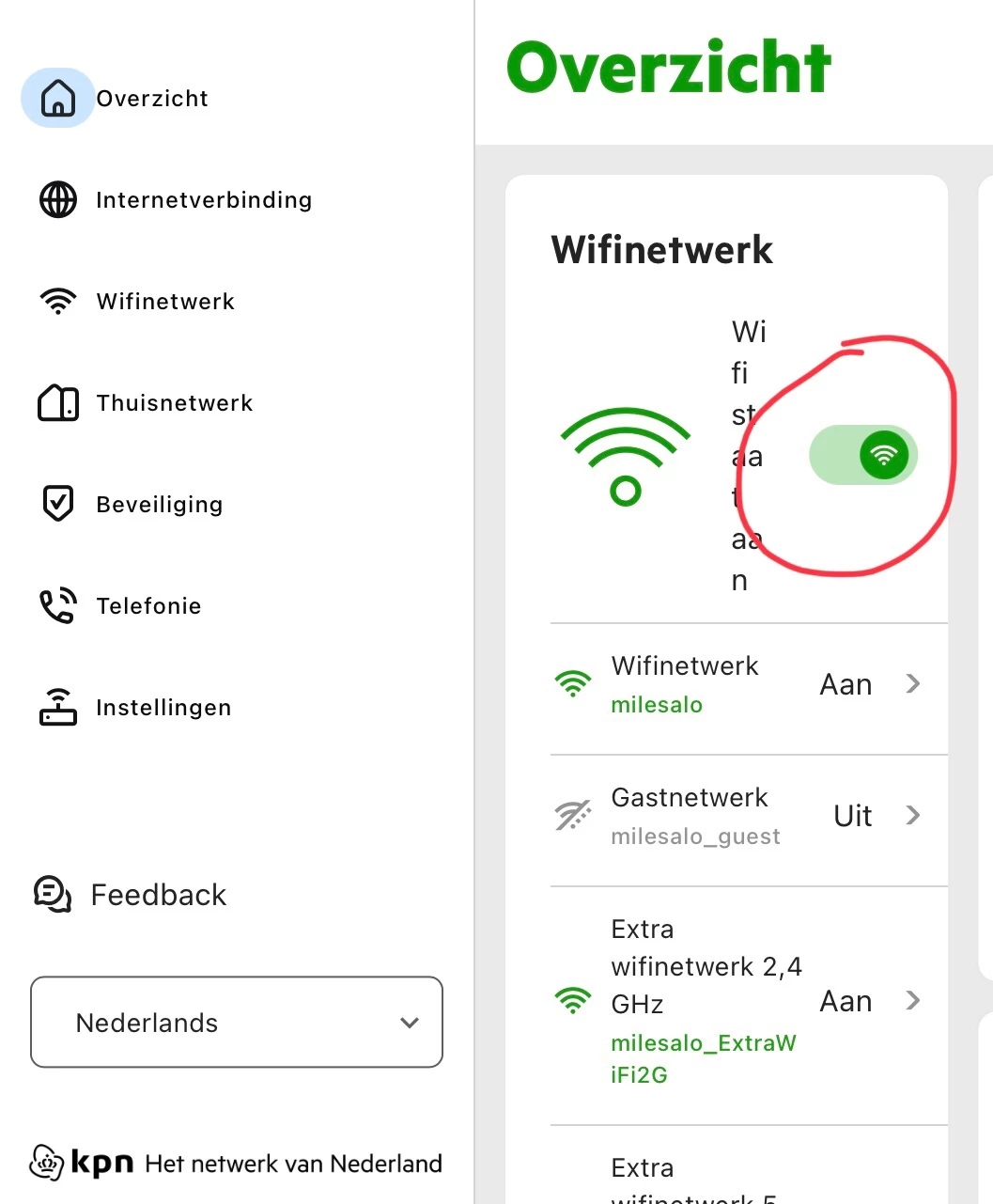 Alleen onder Wifi aan staat het lijstje met wifinetwerk, gastnetwerk en 2,4 en 5 Ghz alles op uit.