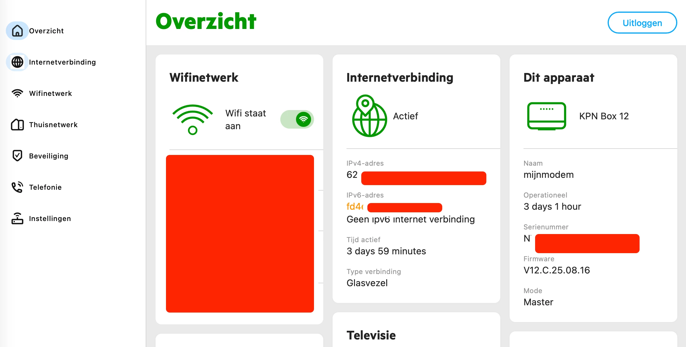 Sinds vorige week na contact helpdesk (medewerker heeft harde reset gedaan), alles opnieuw moeten instellen op mijn modem v12. geen probleem alles lijkt te werken, maar sindsdien staat er bij IPv6-adres: “geen IPv6 internet verbinding”,