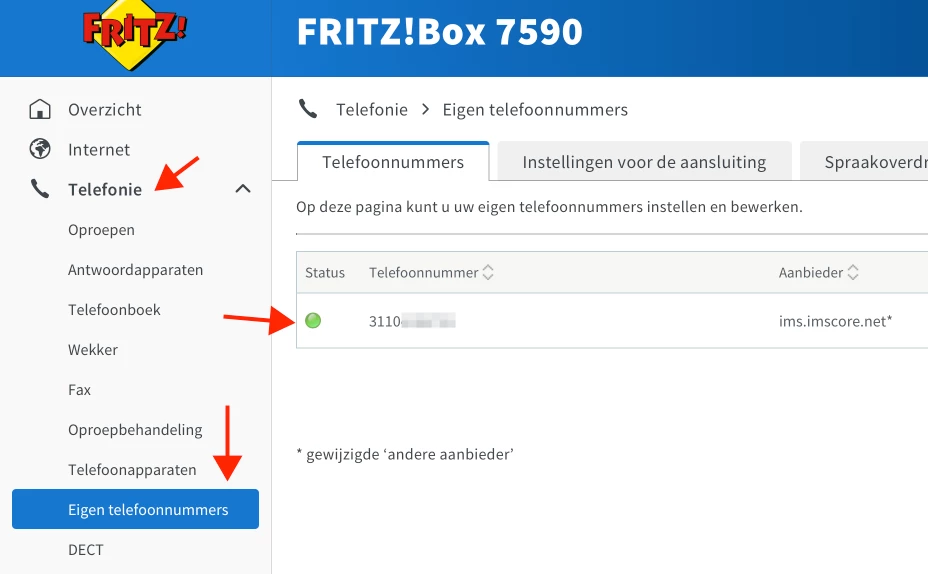 Daarom mijn vraag: Kan je inloggen in de Fritzbox? Zie je jouw nummer wel ingesteld staan?
