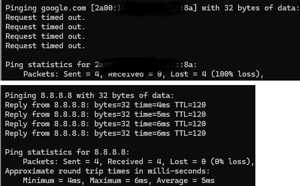 Wel lukt het om te pingen naar 8.8.8.8, dus het lijkt een probleem met de ipv6 DNS te zijn, echter als ik deze aanpas naar een alternatieve DNS server blijft het probleem bestaan. Ik kan de sites via mijn browser wel gewoon bereiken gelukkig.
