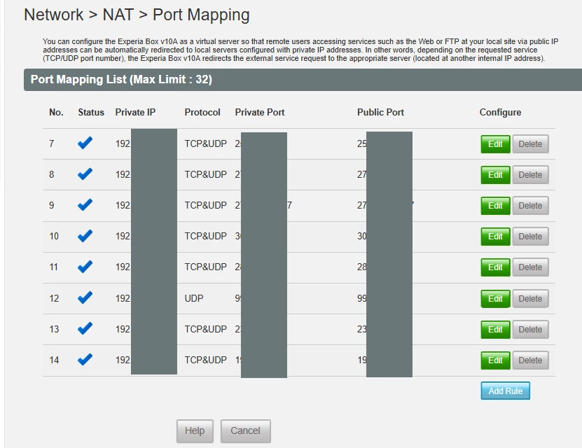 Mag ik vragen hoeveel portmappings in totaal je nu wil aanmaken? Ik heb wat relevante informatie opgezocht maar ik kan (nog) niet vinden wat  het maximale aantal portforwards is bij de v10a