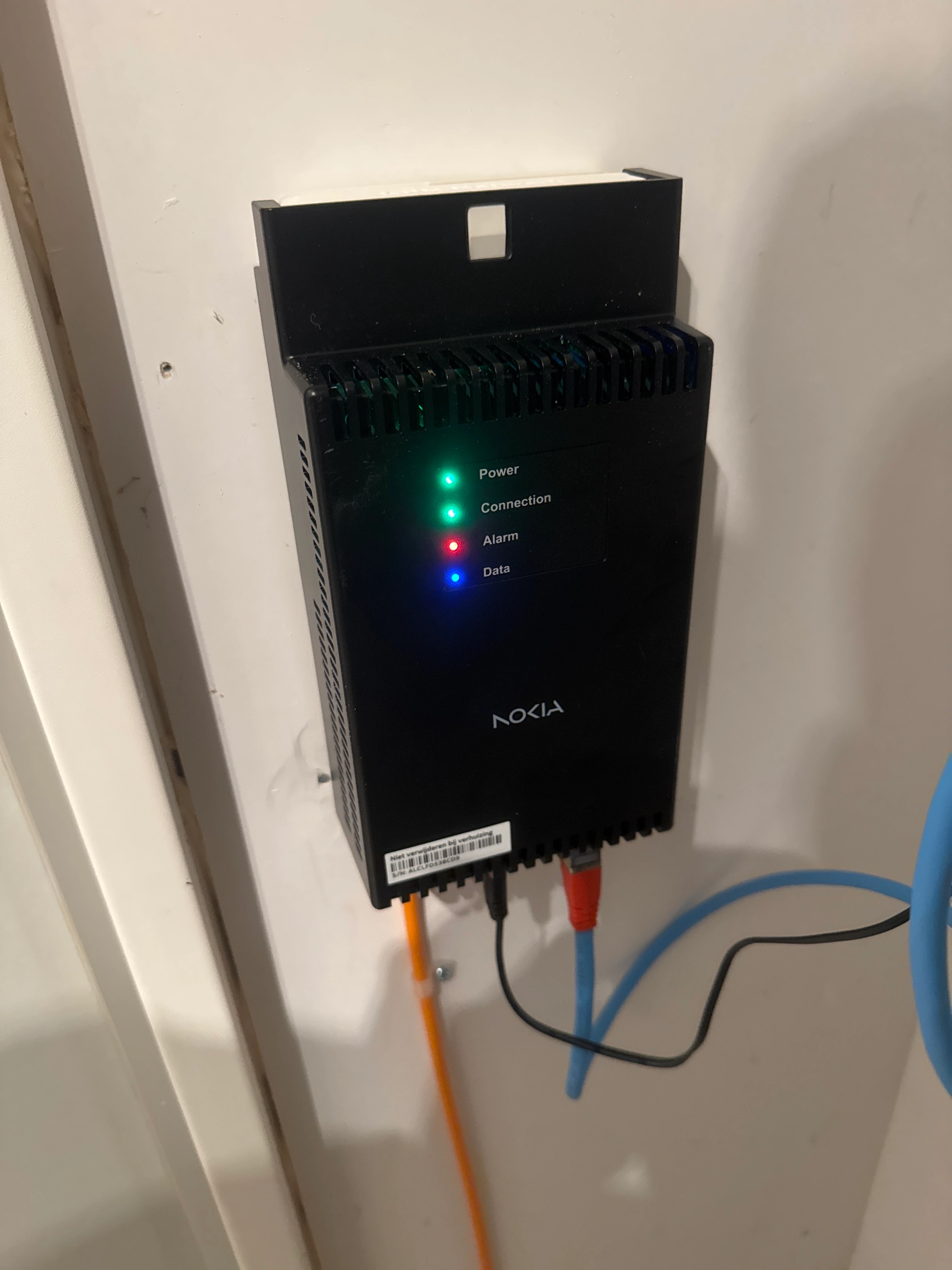 dit lijkt op een te hoge demping van de glasvezel. misschien dat een keertje de Nokia naar beneden schuiven en weer naar boven schuiven oplossing biedt,  zo niet dan inderdaad even bellen naar de klantenservice en aangeven dat je een storing hebt. hier zal uitkomen dat er monteur nodig is om dit op te lossen.
