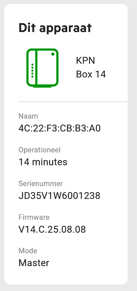 @Alexandra van KPN helaas werkte deze optie niet... Heb de SW's een hard reset gegeven en dat werkte wel. Dus Box 14 en de SW 2's mooi op de laatste firmware. Echter wat me opvalt is dat op de interface van alle SW's 2 de extra wifi en de gastwifi uitgeschakeld zijn terwijl het in de Box 14 wel aan staat. Bij de vorige versie kon je in het modem een vinkje zetten bij Extenders meenemen. Echter is deze optie er niet meer in de nieuwe firmware van Box14.