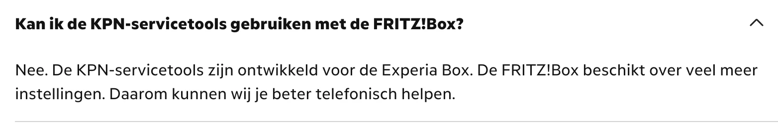 Nee. De KPN-servicetools zijn ontwikkeld voor de Experia Box. De FRITZ!Box beschikt over veel meer instellingen. Daarom kunnen wij je beter telefonisch helpen. Met KPN Service Plus krijg je altijd de beste hulp. Makkelijker voor ons en voor jou.