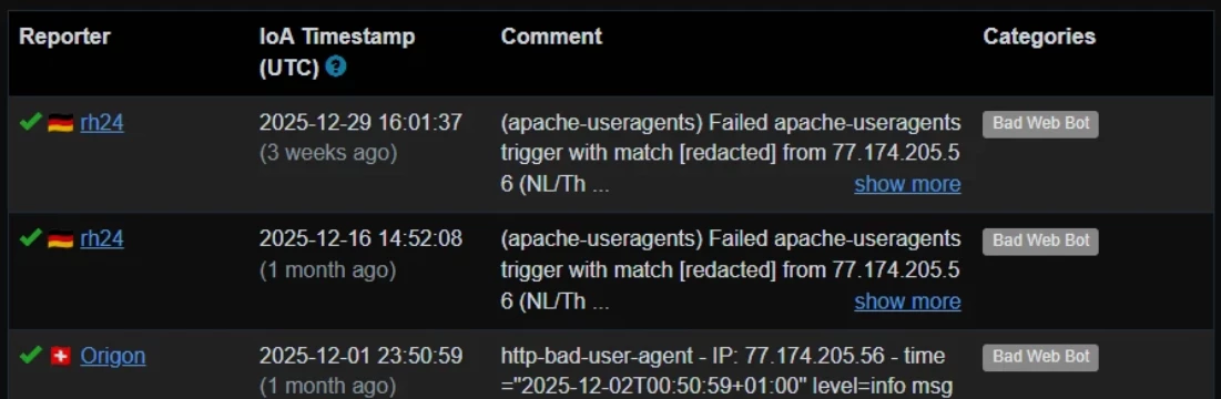 HIeronder een deel van de logging. Deze IP adressen worden geblokkeerd omdat ze in de abuseipdb zitten die mijn firewall op de server gebruikt om ongewenst volk te weren. Niet alle adressen zijn meer actueel omdat er een lijst van de afgelopen 120 dagen wordt gebruikt.