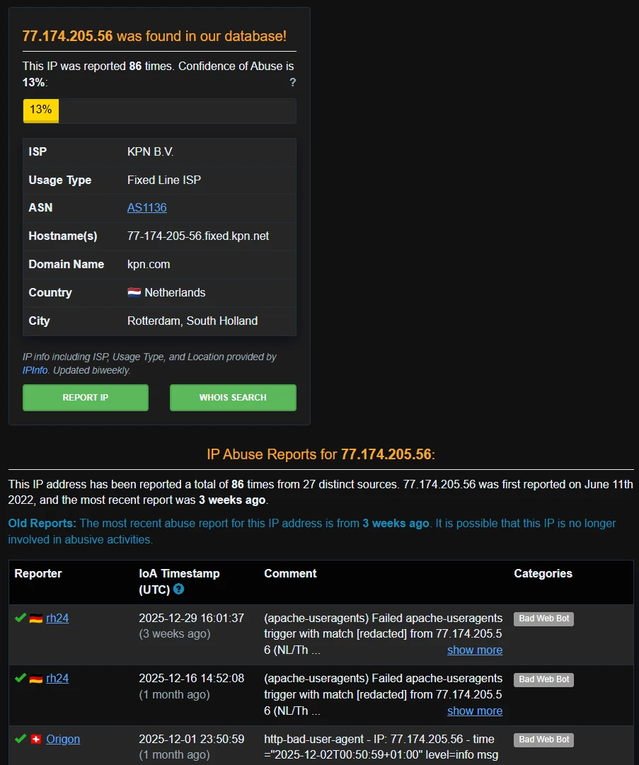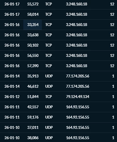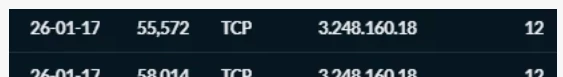 Ik zie bijv. 3.248.160.18, AS16509, Amazon Web Services als voorbeeld. Maar het is een hele rits vanuit Digital Ocean, Azure, etc. die probes doen op een serie poorten.