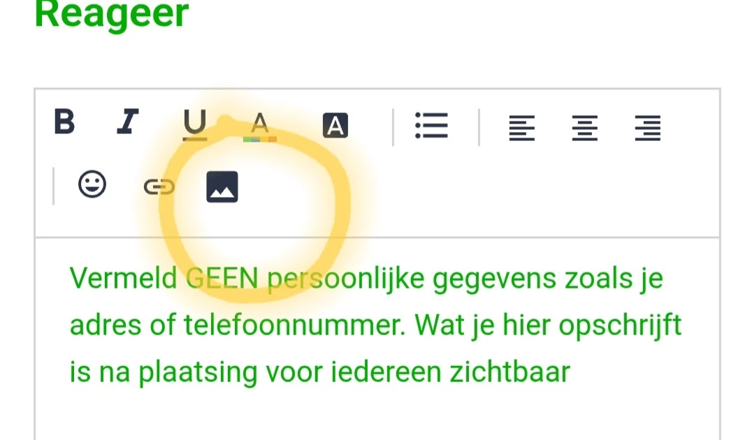 Als je een foto hebt gemaakt kan je die uploaden met het laatste afbeeldingsicoontje bovenin.