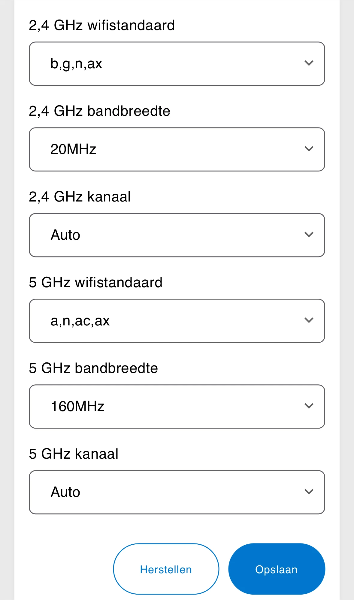 Heel erg vreemd dat de 5Ghz wel signaal geeft en 2.4Ghz niet. Hoe staan de instellingen op dit moment qua Mhz, kanalen etc?