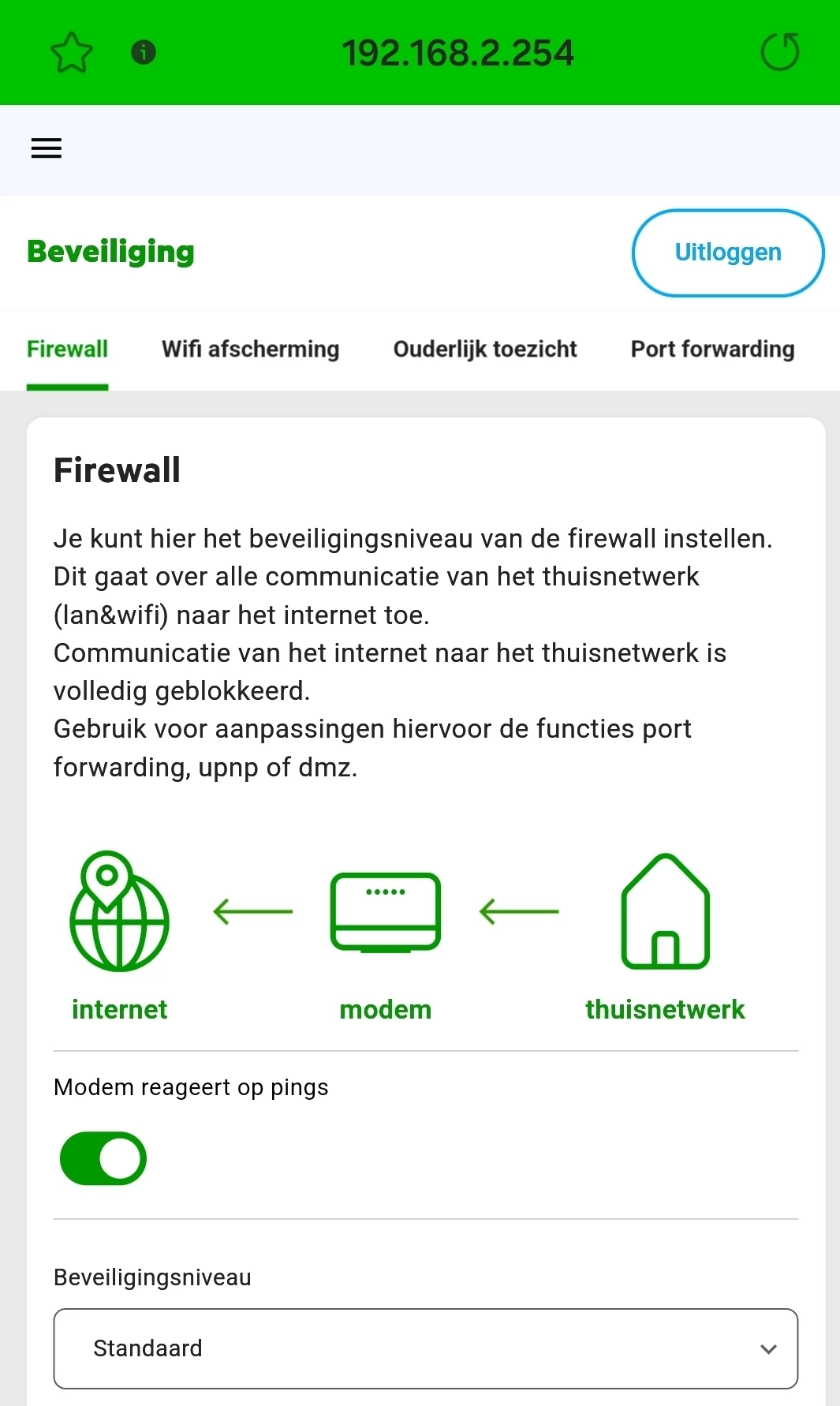 Kan je inloggen op http://192.168.2.254? Zet daarop de firewall eens op "Standaard".