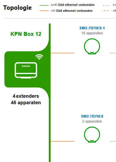 In Topologie in de router zie ik de KPN Box 12, 4 extenders en 46 apparaten staan. Echter in Verbonden apparaten zie ik alleen de Box en 2 extenders met (23 verbonden) apparaten. Ik mis ook apparaten.
