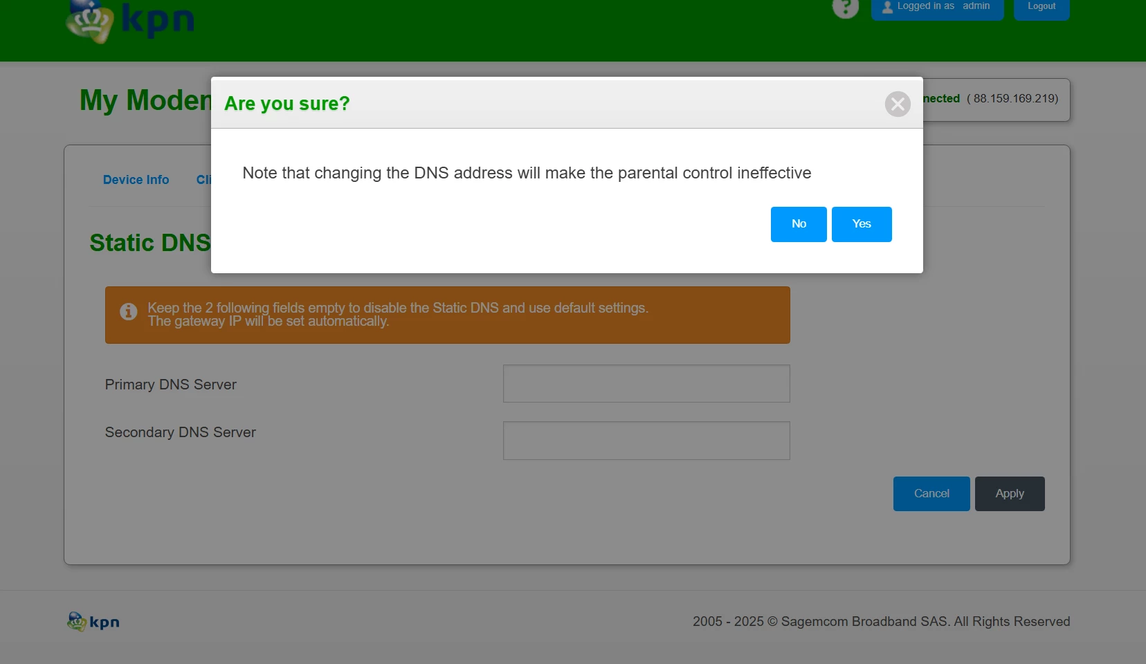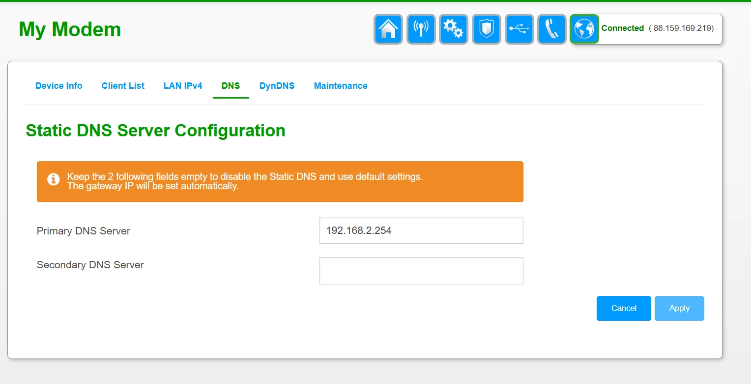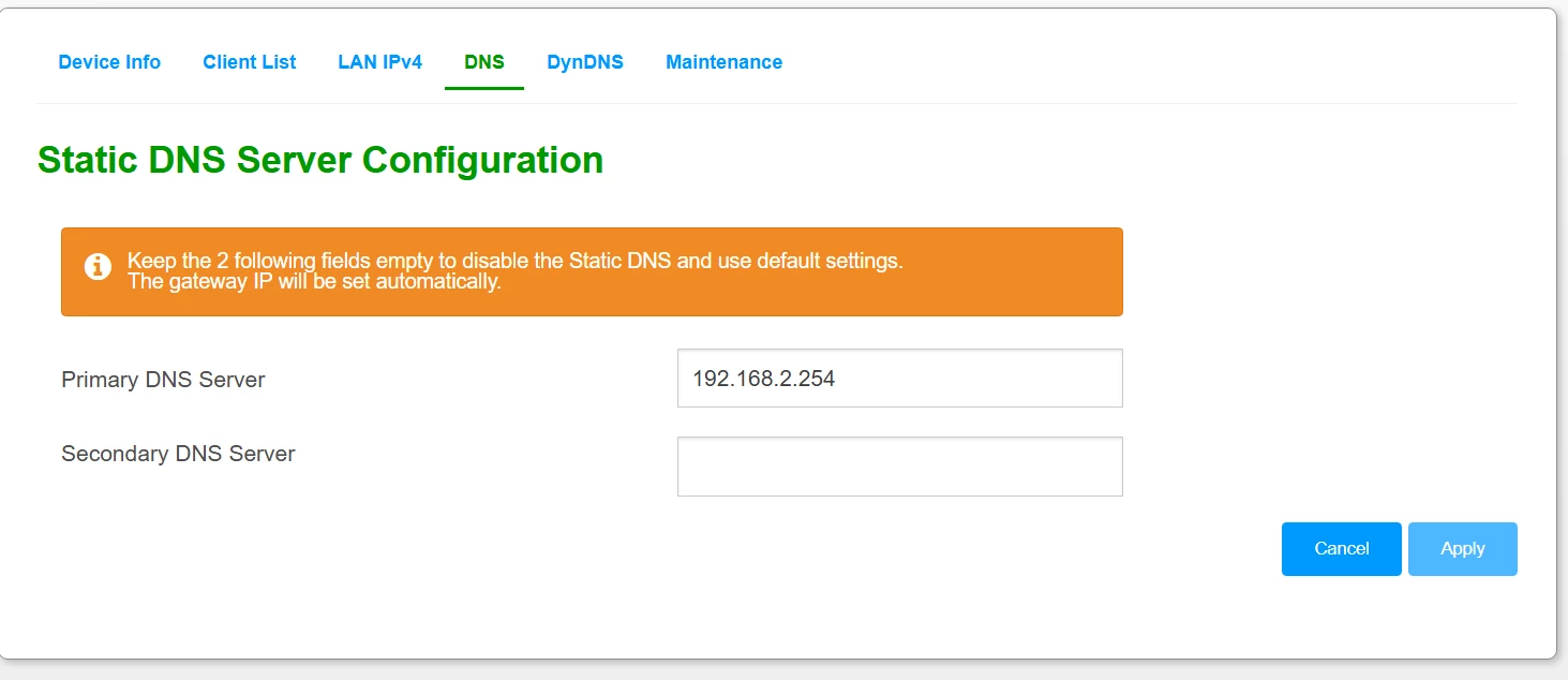 DNS mag niet leeg en ook op 192.168.2.254 wijzen. De KPN modem heeft geen eigen DNS server en moet een DNS server binnen LAN of op WAN gebruiken. Zet b.v. voor dns.kpn.com (145.7.191.35) of een andere KPN DNS-servers in het veld. Je mag ook andere 3rd party servers gebruiken. Als je DNS Proxy aan laat staan, gebruik de KPN modem automatisch de KPN DNS servers