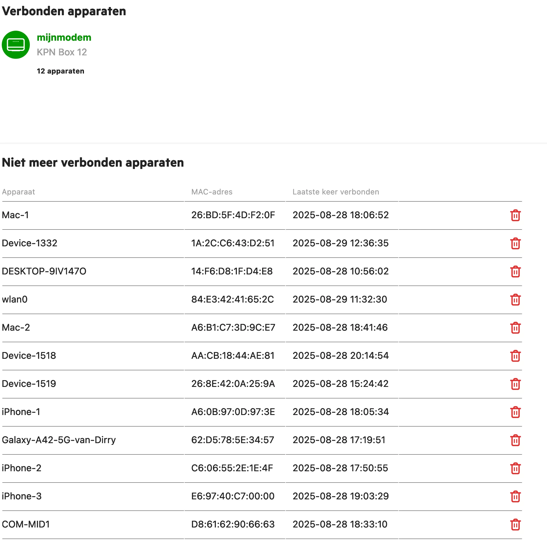 Is de situatie nog steeds hetzelfde ​@KlaasD? Zo ja, zou je dan deze lijst met niet meer verbonden apparaten eens leeg willen maken door achter elk apparaat op het prullenbakje te klikken? En daarna het modem even opnieuw op laten starten? Ben benieuwd hoe het er dan uit komt te zien!