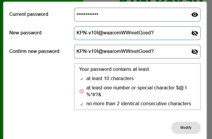 Het wachtwoord accepteert slechts een beperkt aantal speciale tekens, zie de aangegeven lijst. Haal het minteken na KPN eens weg. Dan verwacht ik dat de rode melding verdwijnt en de Modify toets actief wordt.