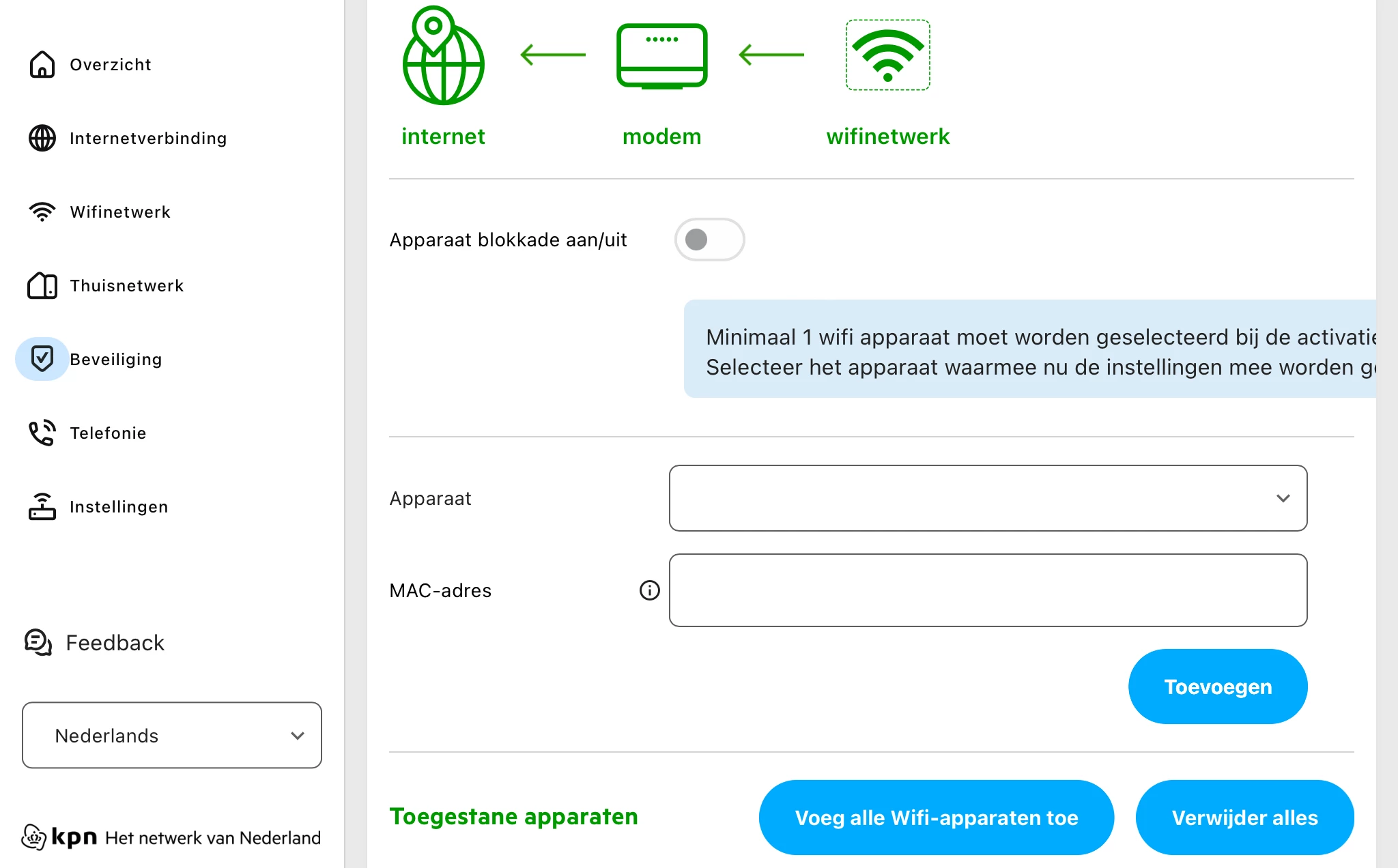Dank voor je melding! Dat het apparaat grayed out is en je daardoor geen dropdown kunt gebruiken, klinkt inderdaad niet zoals het hoort. Ook dat het handmatig toevoegen van het MAC-adres of via “alle apparaten toevoegen” niet werkt, bevestigt dat dit geen instelling is die je zelf kunt oplossen.