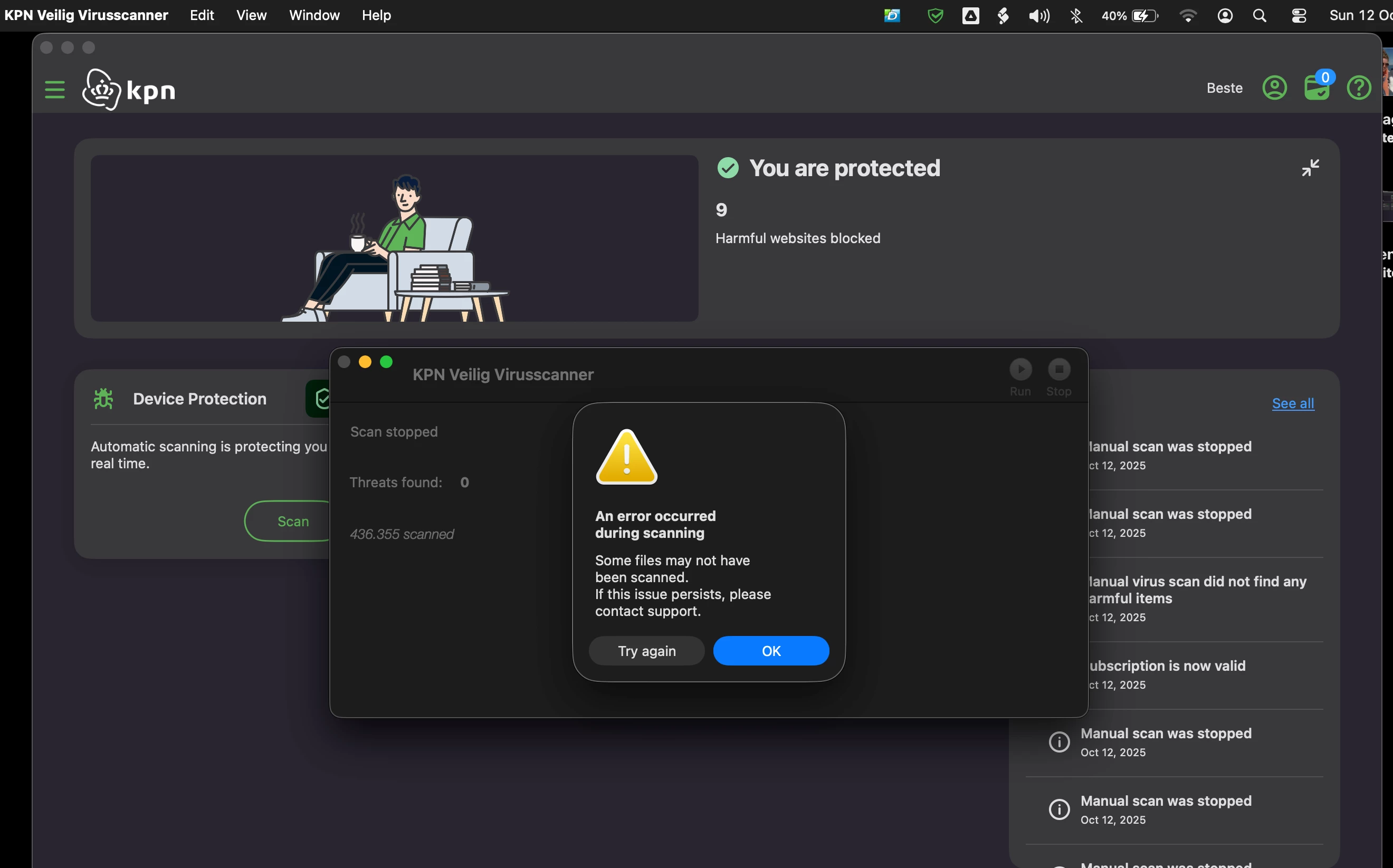 Op mijn MacBoocAir M1 chip staat nu Tahoe MAC -OS Rev 26.0.1. De KPN scanner stopt scannen halverwege, met de melding contact op te nemen met support. Hoe gaan u dit oplossen? Ik heb de MAC opnieuw opgestart maar nog steeds dezelfde fout. de KPN veilig software geeft aan dat ik de laatste versie gebruik.
