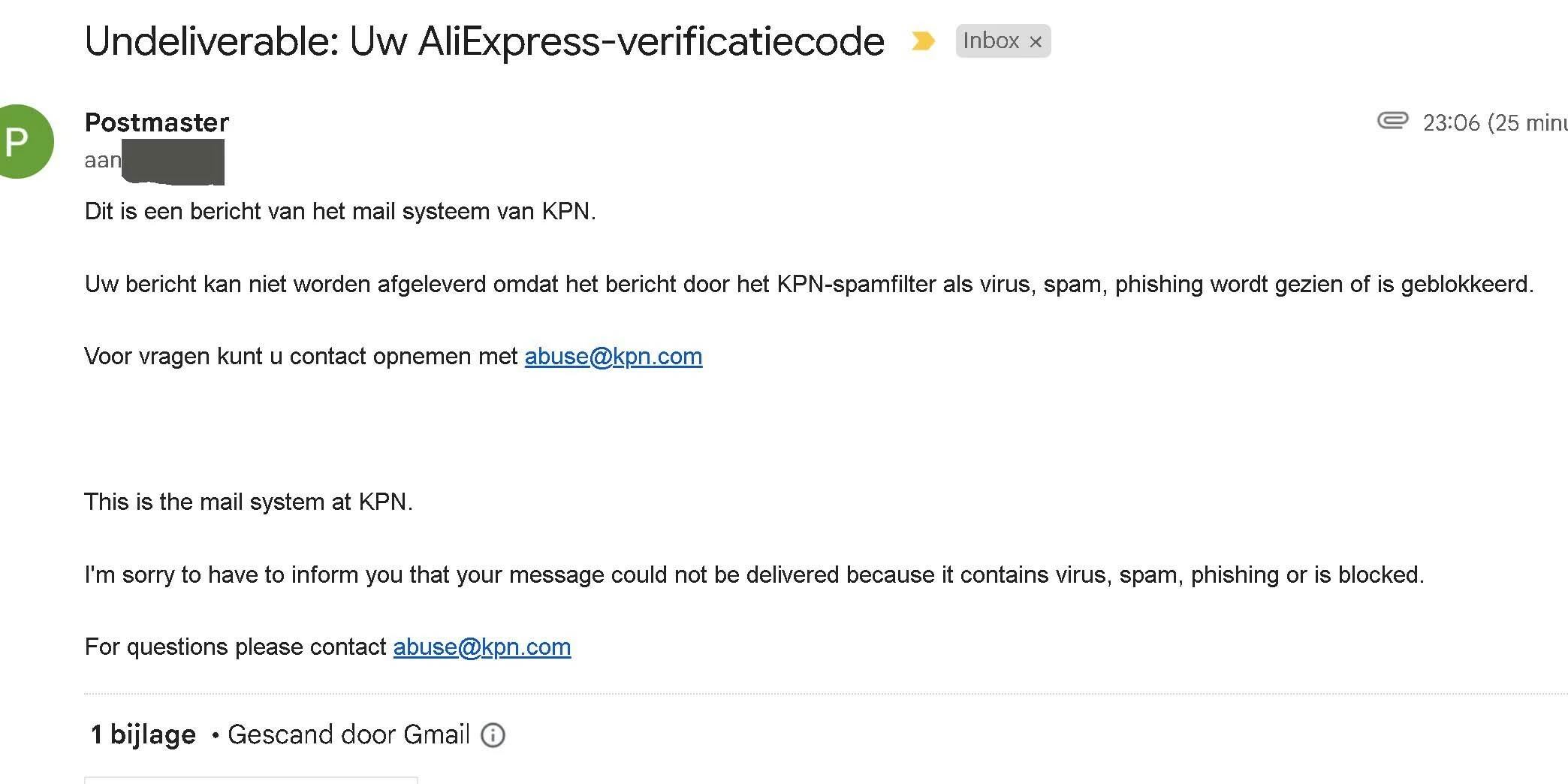 Hi ​@WhoopySnoopy, ik zie dat KPN Abuse medewerker Dennis ABD uitleg heeft gegeven over de werking van het spamfilter, en hoop dat dit stukje nu duidelijk is. Verder lees ik terug dat je zelf al met het idee kwam om deze verificatiemail via een ander mailadres te laten lopen, en dat lijkt me hier wel een handige workaround. Ik hoop dan ook dat het op die manier snel lukt om je refund af te ronden bij AliExpress!