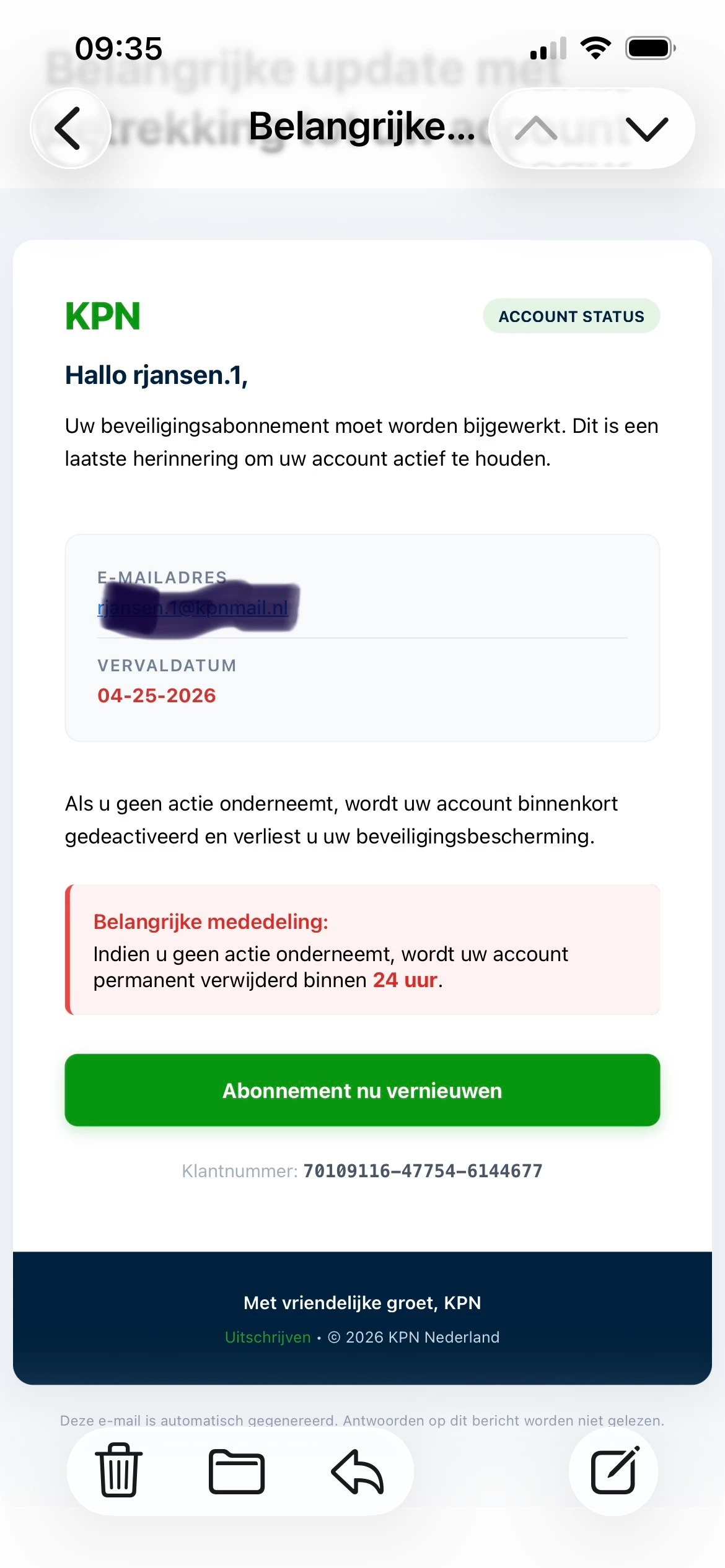 Phishing mail ontvangen van KPN over beveiligingsabonnement