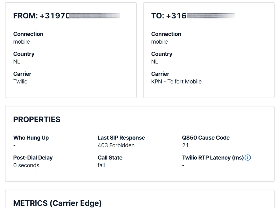 Sinds 4 augustus werkt deze oproep niet meer naar mobiele nummers van KPN. Het werkt wel nog prima naar andere providers, echt alleen KPN lijkt spraakoproepen van 0970 te blokkeren. We hebben het vanaf verschillende 0970 nummers geprobeerd. Wij hebben geen simkaarten, maar alle oproepen gaan geautomatiseerd via Twilio. Zij geven aan dat het aan KPN ligt, aangezien we als respons 403 Forbidden terugkrijgen.