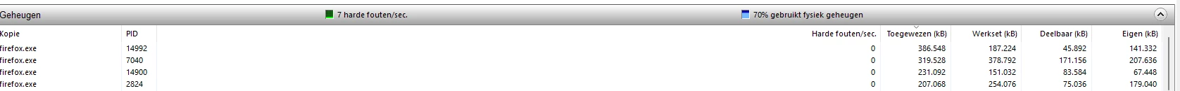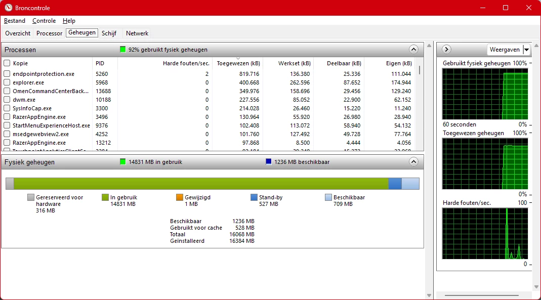 Doe eens Start, dan Broncontrole intypen en die starten, daar geheugen uitklappen via het pijltje rechts, dan zou je een beter overzicht moeten zien wat er zoveel geheugen gebruikt.