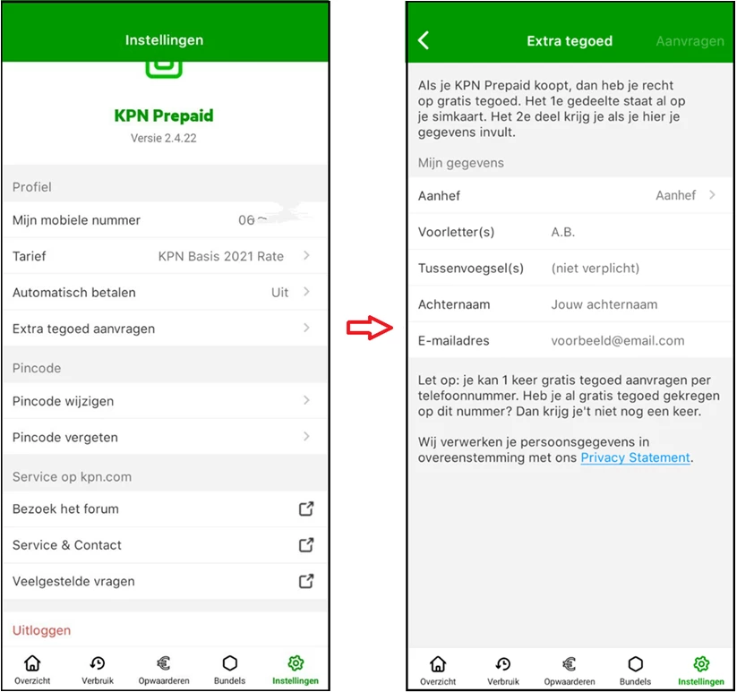 Als je de Prepaid app opent, ga je naar Instellingen waar je optie Extra tegoed aanvragen vindt.