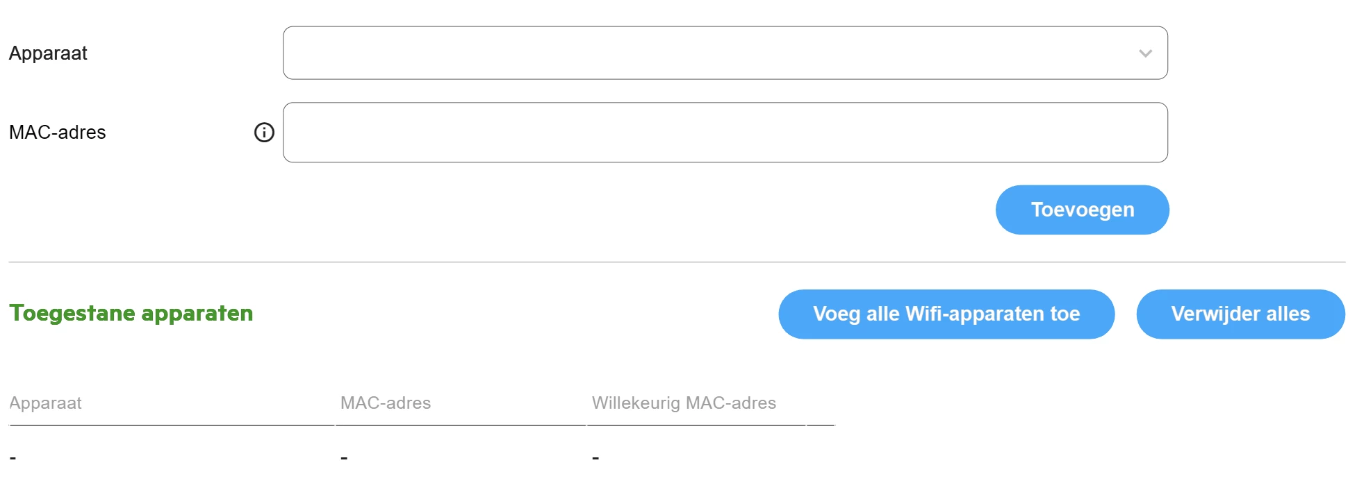 Het apparaat veld zou een lijst met apparaten op het netwerk moeten laten zien, maar is niet selecteerbaar (grayed-out). Het Mac adres geprobeerd met copy/paste en handmatig intypen. Of alle apparaten toevoegen via de knop. Niets werkt.