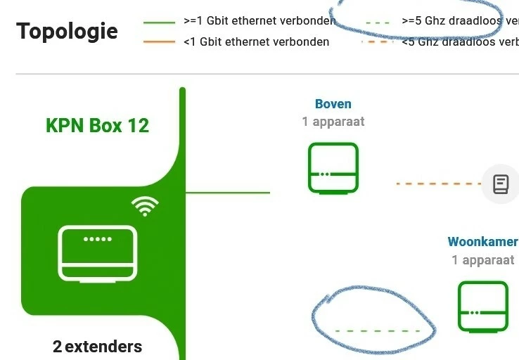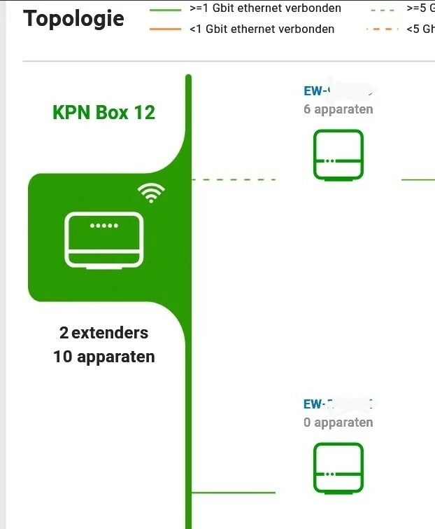 1 EW heeft wel de blauwe led bij wifi de andere niet die blijft groen. Kijk ik in de topologie wisselt de verbinding heel vaak een apparaat beneden verbind ineens met de EW boven.