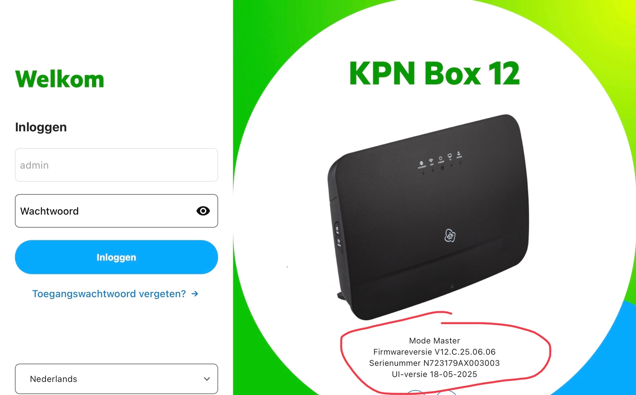 Je kunt zelf zien of jouw Box 12 voorzien is van de nieuwe softwareversie. Open een browser en ga naar mijnmodem.kpn192.168.2.254 of instellen.local. Op de inlog pagina wordt de Softwareversie weergegeven.