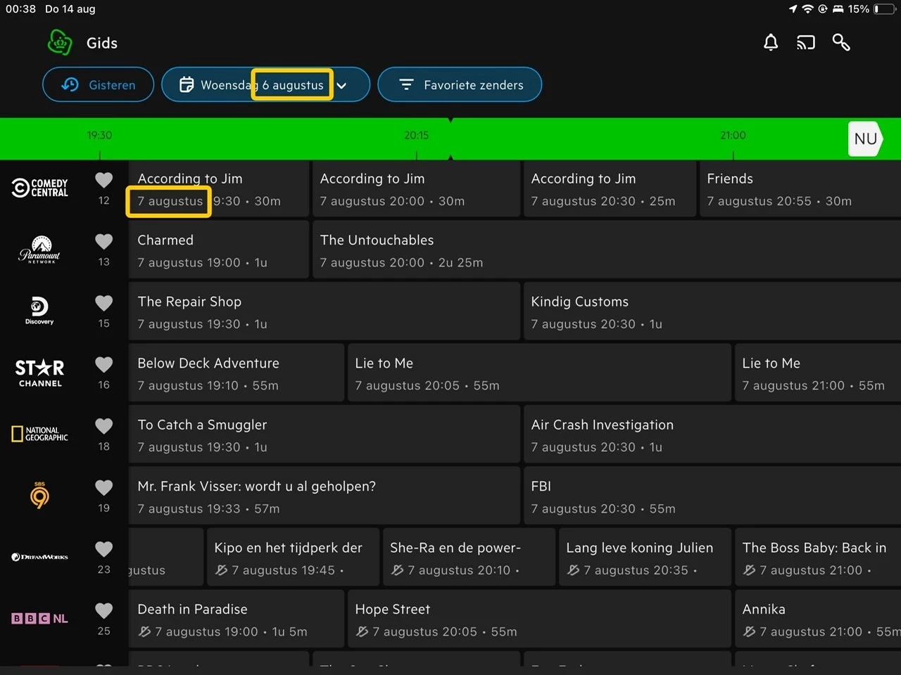 Voor de zekerheid, staat de gids alleen zo in de app, of ook op de tv-ontvanger? Als het ook zo op de ontvanger staat kan het ook een andere oorzaak hebben.