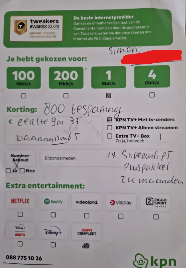 Ik heb hier al meerdere topics gezien waarbij bij verkoop aan de deur het niet goed gaat omdat de deurverkoper wat anders voorspiegelt, dan wat KPN uiteindelijk bevestigd.