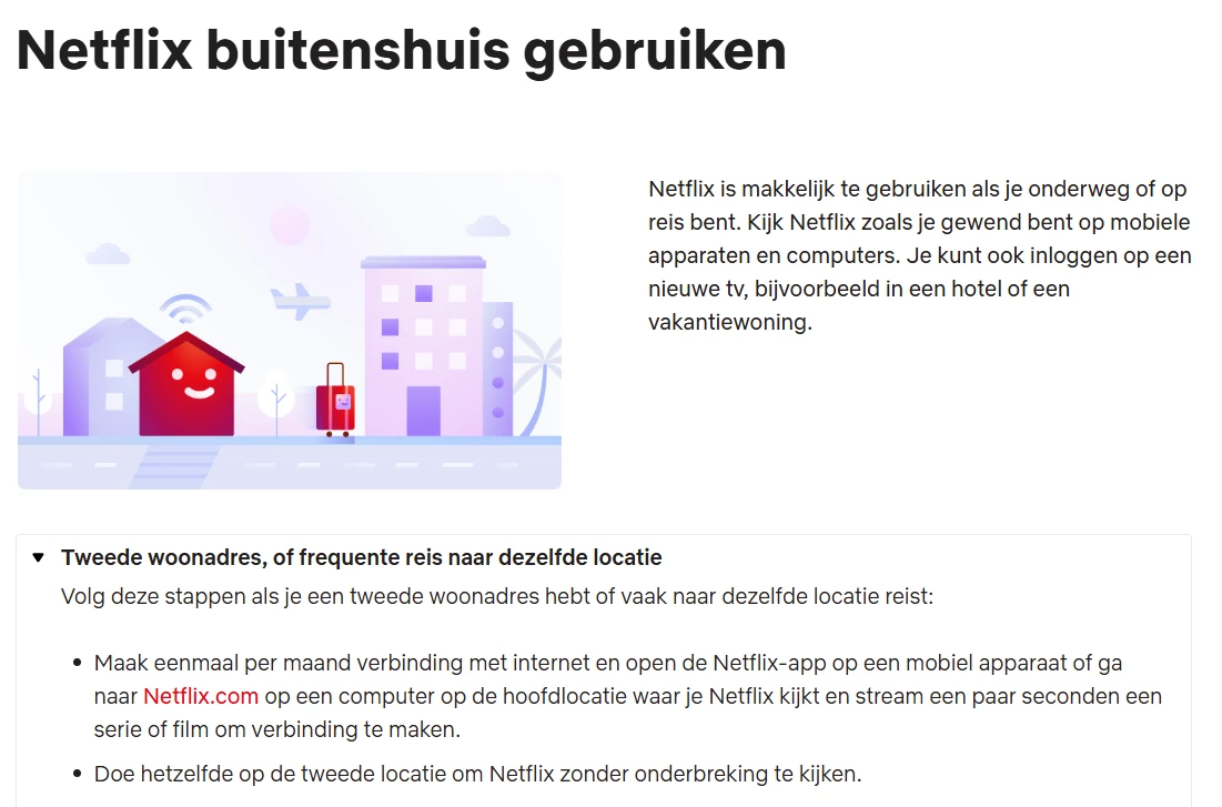 • Netflix buitenshuis: bedoeld om op apparaten buiten je eigen huishouden te gebruiken, bijvoorbeeld tijdens vakantie of op een tweede woning.