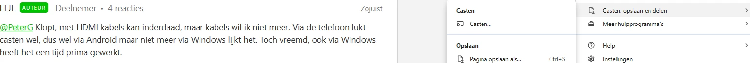 @PeterG Klopt, met HDMI kabels kan inderdaad, maar kabels wil ik niet meer. Via de telefoon lukt casten wel, dus wel via Android maar niet meer via Windows lijkt het. Toch vreemd, ook via Windows heeft het een tijd prima gewerkt.