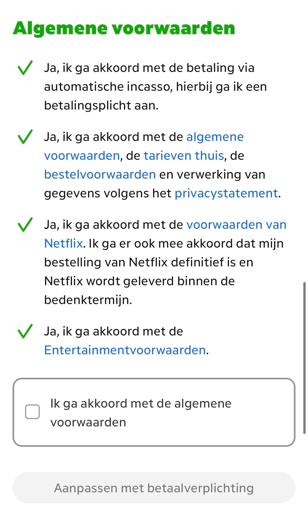 @Jeroen 1962  Zie bijgevoegd screenshot. Dit is het scherm dat tevoorschijn komt nadat ik Netflix bij KPN wil bestellen. Je doet wel degelijk zaken met Netflix, want jij bent immers akkoord gegaan met de algemene voorwaarden van Netflix.