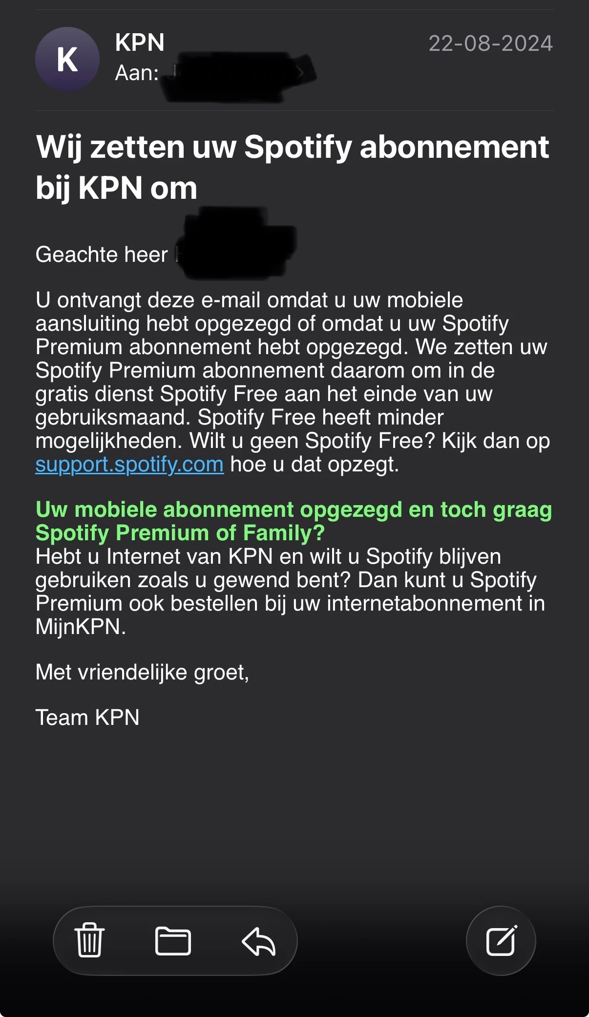 Hallo. Ik heb op 22-8-2024 voor het eerst geprobeerd mijn Spotify premium abonnement op te zeggen. Ik heb hier een bevestigingsmail van gekregen. Er is echter niks aangepast en opzeggen bij Spotify lukt ook niet. Die geven aan dat het via KPN moet. Meerdere malen gebeld met KPN maar tot op heden is het niemand gelukt. Kan iemand via hier mij hierbij helpen? Er gaat na het opzeggen dus al 19 maanden wel het maandelijkse bedrag van mijn rekening…