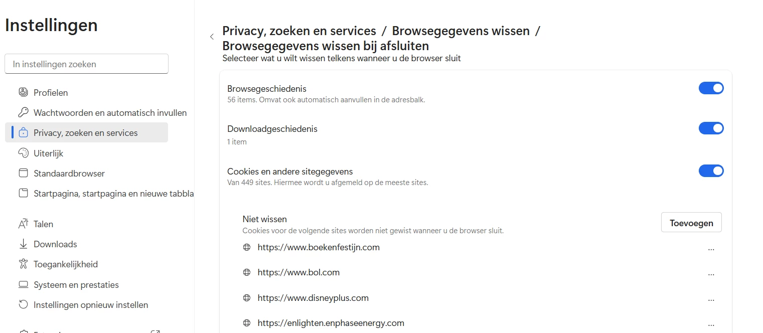 En je kan ook in Edge instellen dat bepaalde sites niet gewist moeten worden.
