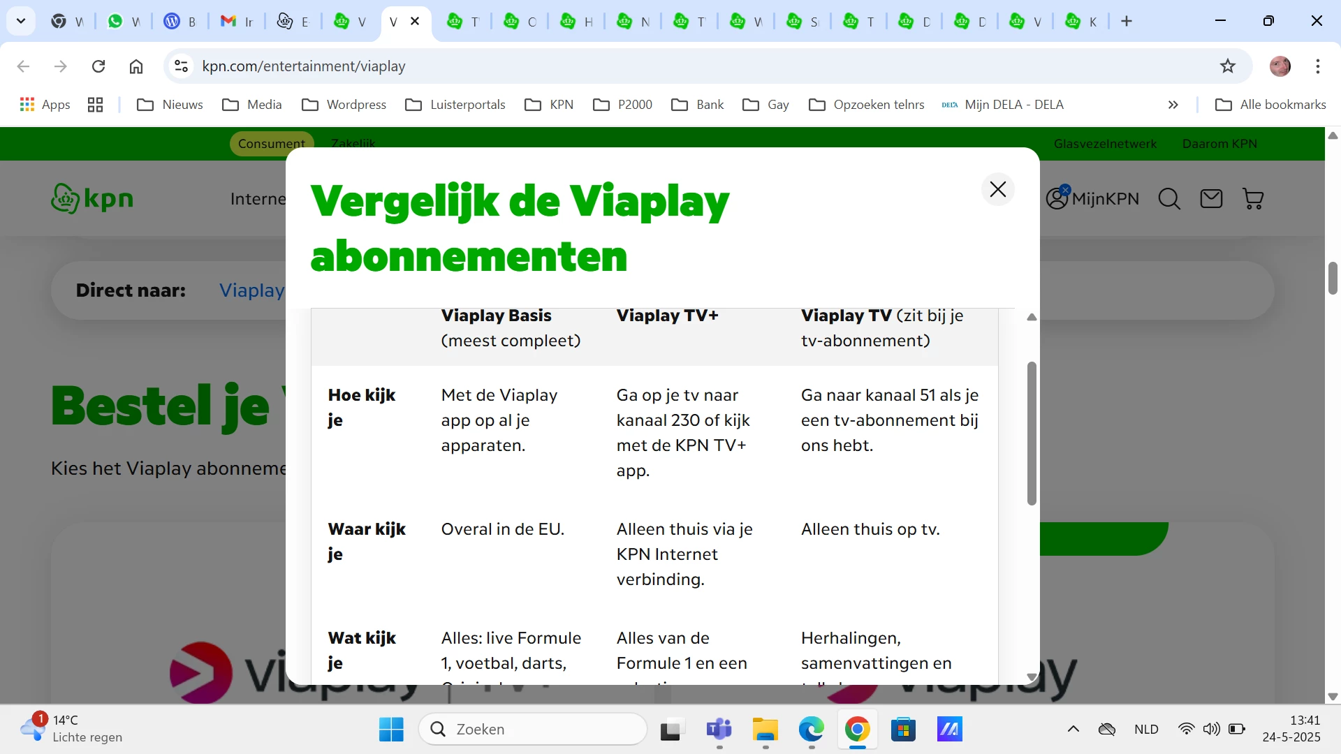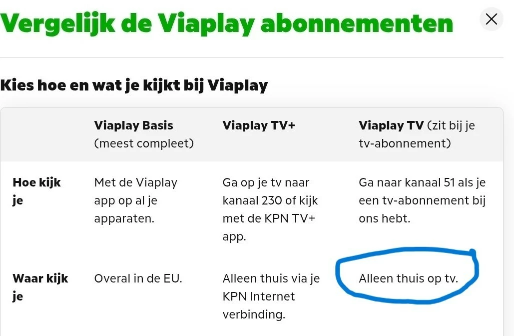 Na drukken op "vergelijken” zie je dat Viaplay TV+ alleen thuis te zien is. (en die andere geven we nog even door 😉). Maar daar is het alleen fout voor Viaplay TV, de informatie dat Viaplay TV+ alleen thuis is klopt gewoon. Dus waar ​@Jac 1852 andere informatie heeft gezien weet ik niet.