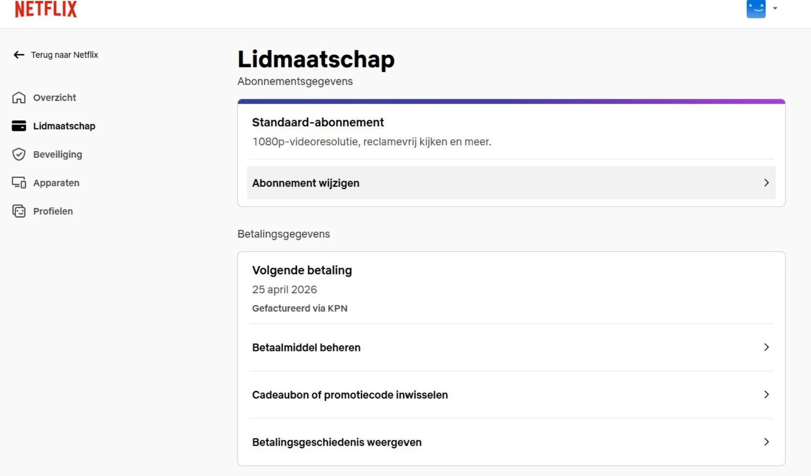 De wijziging gaat direct in, en wordt via KPN gefactureerd. Je doet de aanpassing via Netflix.