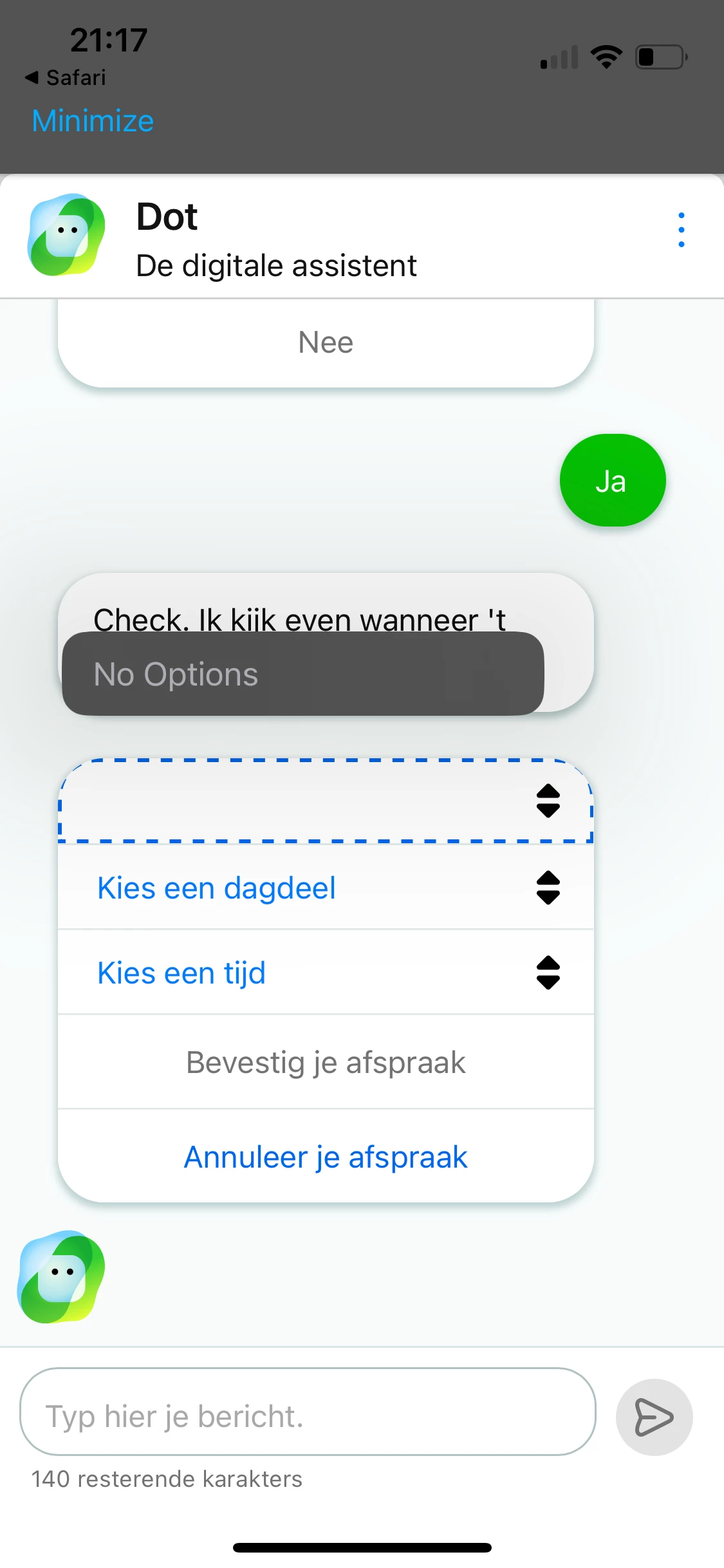 Het kunnen aanmaken van een terugbel afspraak lijkt handig, tot blijkt dat je weer in die chatbot wordt gedumpt, waar het voor mij niet mogelijk was om een afspraak aan te maken door een rare bug in de tijdstip/dagdeel keuze waar ik dus geen opties kon kiezen en dus geen afpraak kon bevestigen. Dit gebeurde zowel op de website als “in de app” (wat domweg weer de website is). En zo lezende ondervinden genoeg mensen problemen met dit traject.